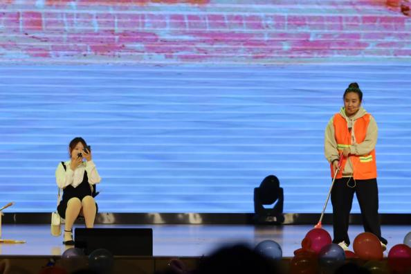 舞台上,我院学子倾情投入,演绎了一段发人深省的故事。他们的参赛作品《标准》,以独特的视角切入基层工作者的日常,讲述了一位环卫工李阿姨在面对层层加码、不切实际的卫生检查标准时,所经历的无奈、挣扎与坚韧。作品巧妙运用夸张的喜剧手法,深刻揭示了形式主义与官僚作风带来的困扰,并最终以“地上怎会没土”的朴素真理,呼唤管理工作中应有的务实与温度。同学们用饱满的激情与精湛的演技,将剧中人物的形象刻画得入木三分,引发了现场观众的强烈共鸣与阵阵掌声。