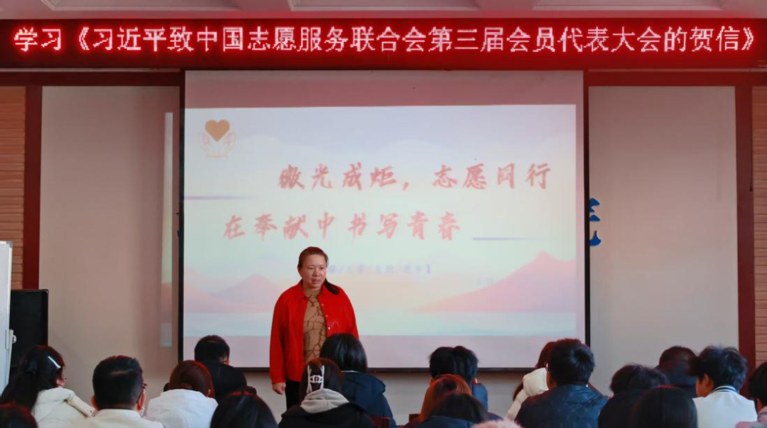 与会师生首先共同学习了贺信的核心要义,深刻感悟习近平总书记对志愿服务事业的高度重视、对广大志愿者的殷切期望。随后,学生代表房雯煜结合自身对贺信精神的体会,分享了她参与志愿服务的亲身经历与动人故事。她从“微光成炬”的奉献精神、“志愿同行”的团结力量出发,讲述了在服务他人、贡献社会过程中的深刻感悟与个人成长,生动诠释了新时代青年将青春融入国家发展、社会进步的责任与担当。她的分享情真意切,引发了在场师生的广泛共鸣。