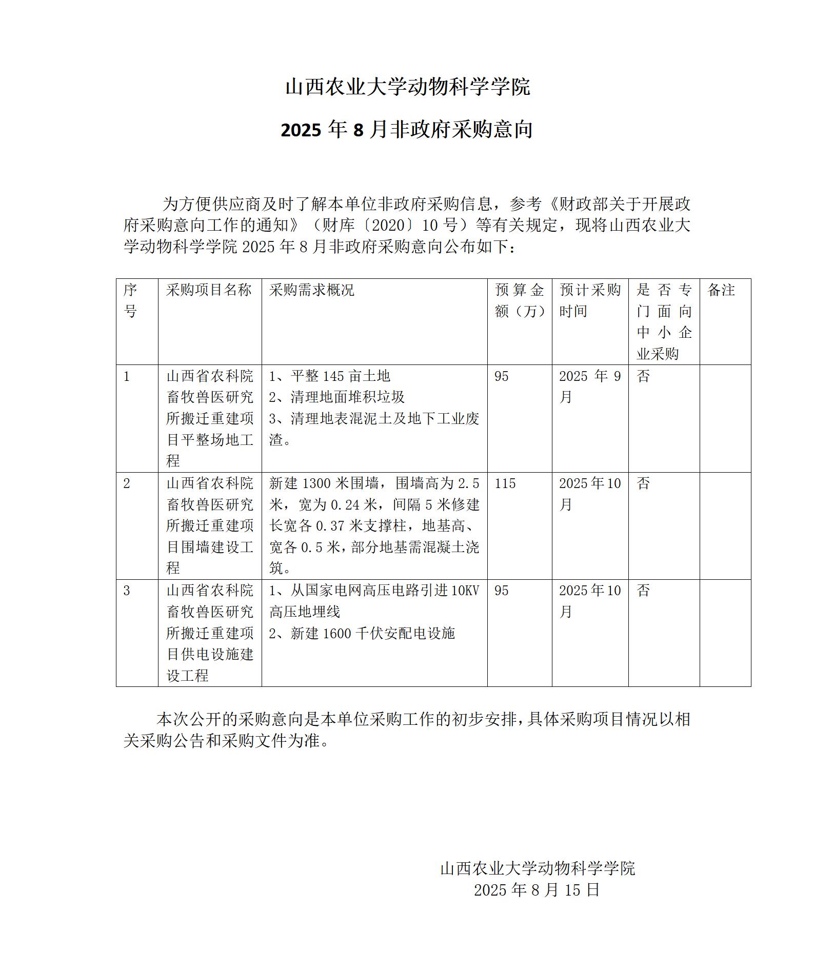 山西农业大学动物科学学院2025年8月非政府采购意向